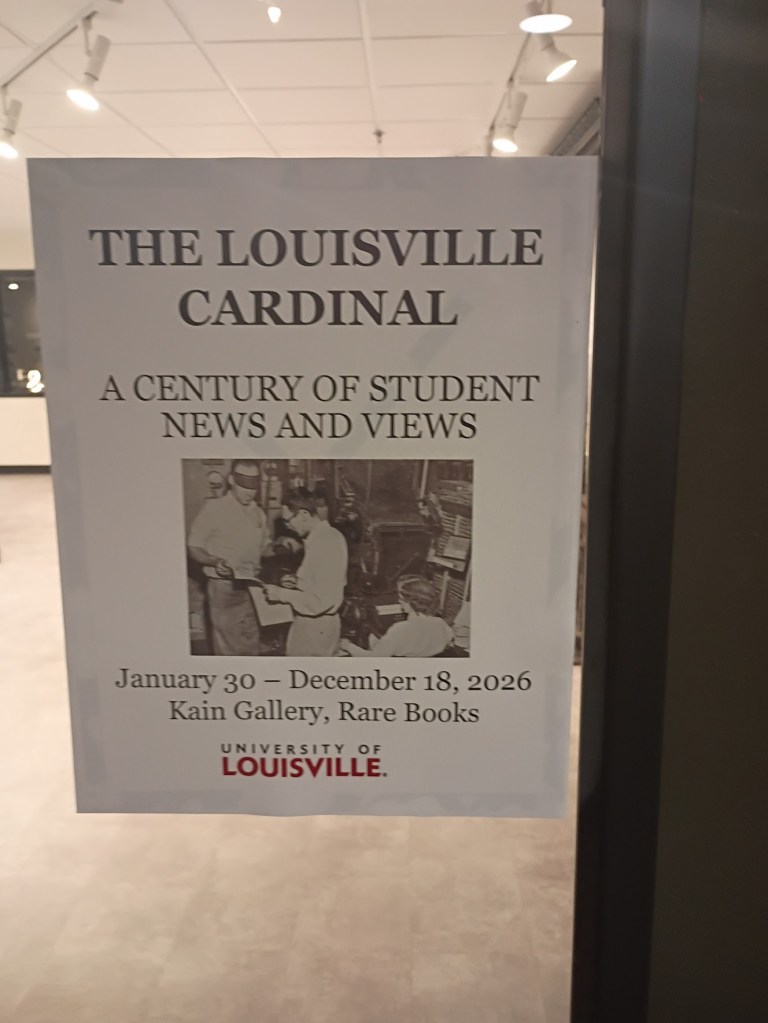 The exhibit is in UofL’s Ekstrom Library, Rare Books Kain Gallery, LL02. It’s open during their regular hours (Monday – Friday 10:00 AM – 5:00 PM) through Dec. 18, 2026.