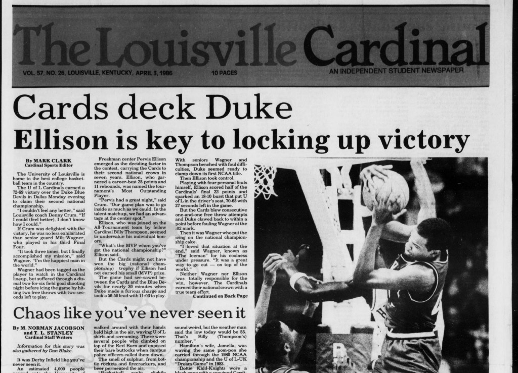 Read The Louisville Cardinal‘s coverage of the championship game from its April 3, 1986 issue at