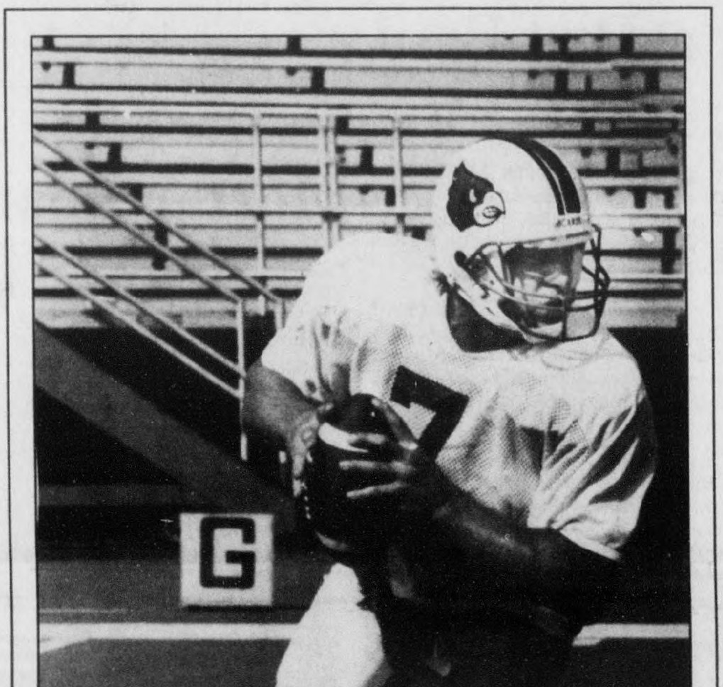 Photo: All The Right Moves – Louisville quarterback Browning Nagle (7) works out at Cardinal Stadium Sept. 12, 1989 as part of preparations for the Cards’ Sept. 23, 1989 home opener with West Virginia. Nagle has thrown for four touchdowns and 438 yards in Cardinal victories over Wyoming and Kansas. Photo by John Simpson. This photo originally ran in the Sept. 14, 1989 issue of The Louisville Cardinal.